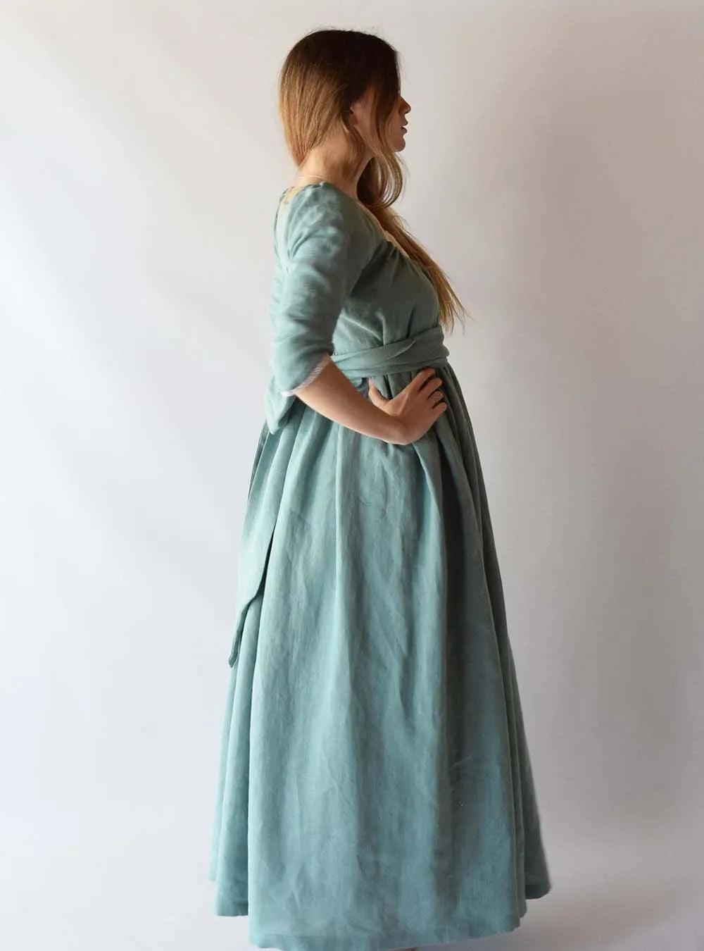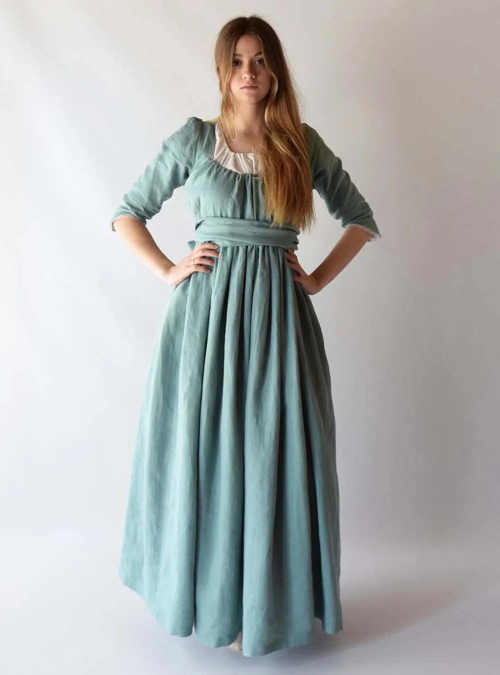 Step into a world of enchanting elegance with our captivating Regency dress. Inspired by the idyllic charm of cottage core and the timeless styles of the Regency era, this dress is crafted from luxurious almond green linen. The feminine square collar and delicate lace ribbon-adorned elbow sleeves exude refined sophistication, perfect for romantic escapades and countryside adventures.