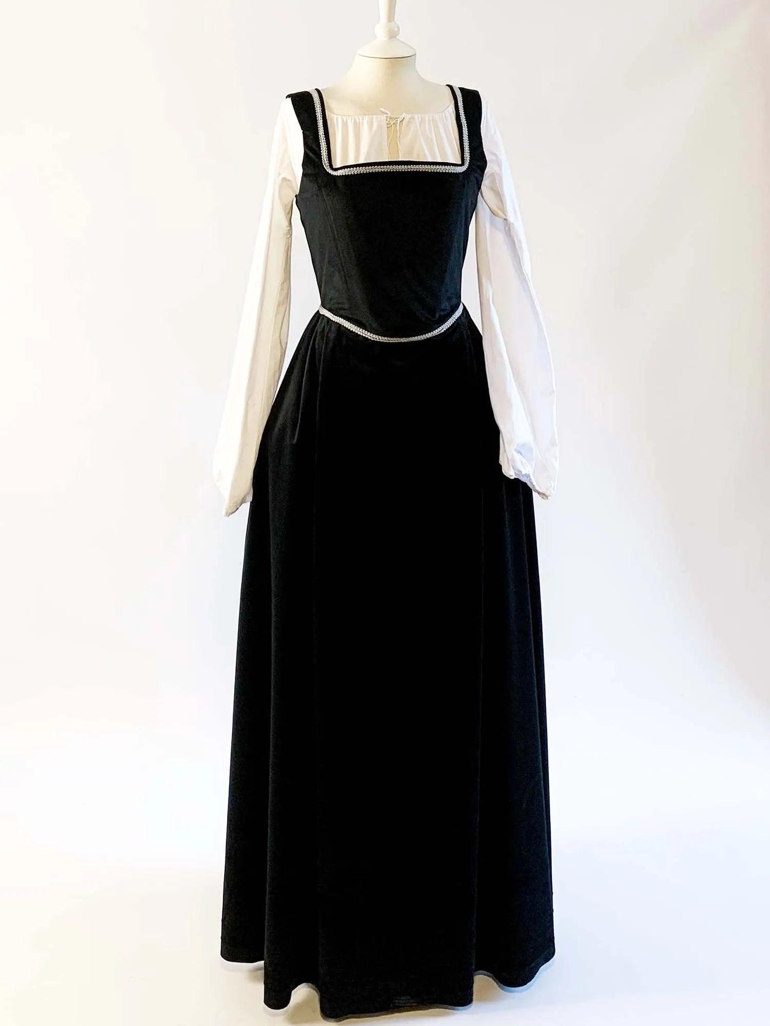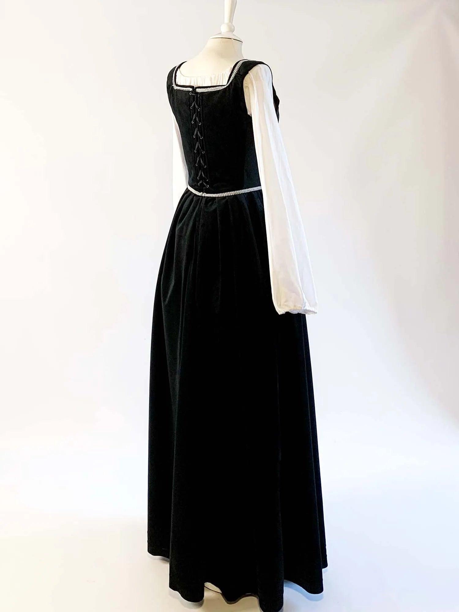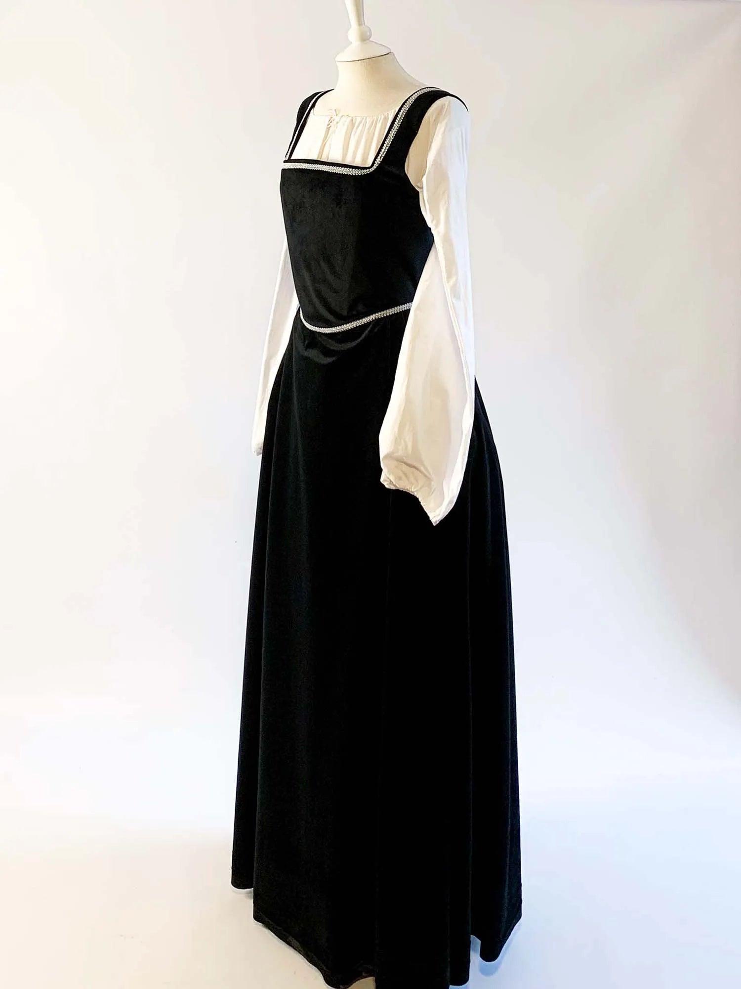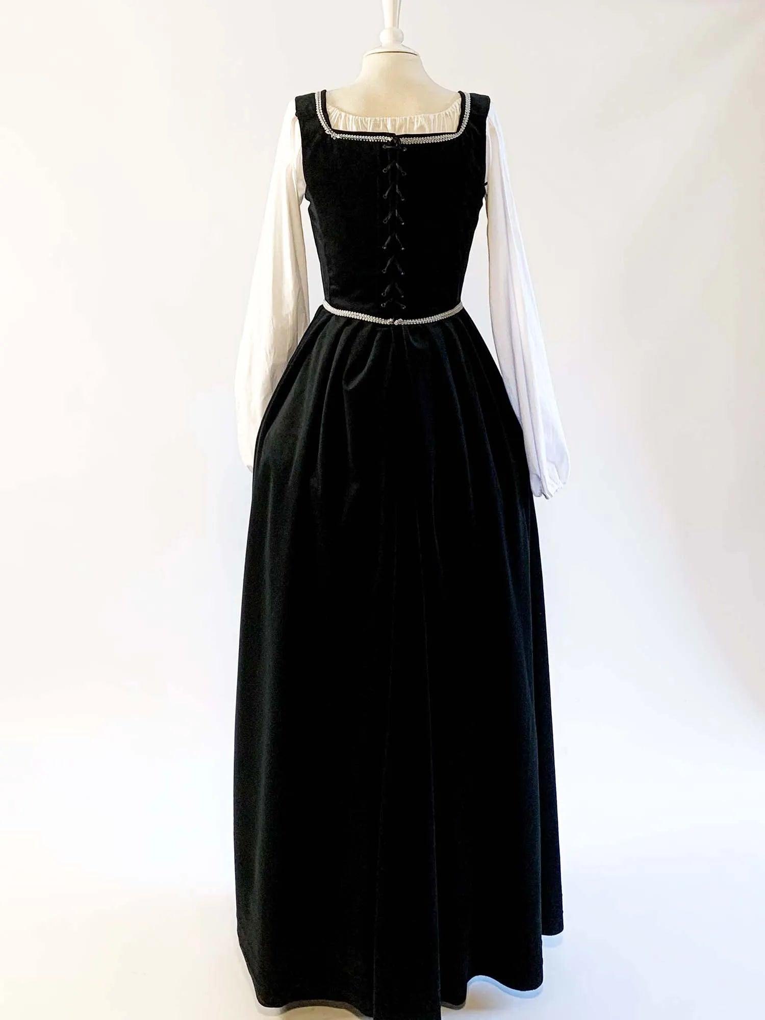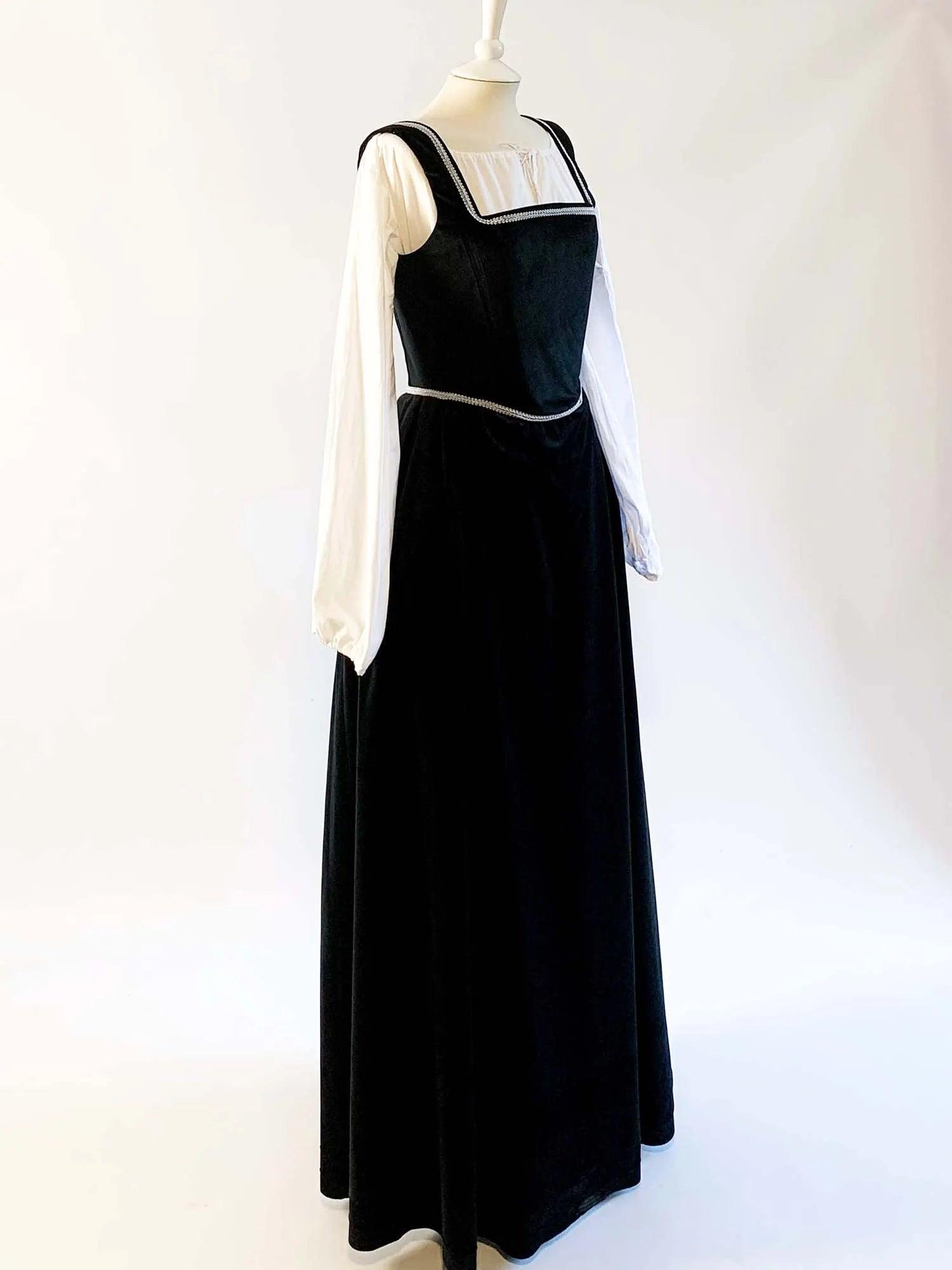 Step back in time with our gorgeous Renaissance Dress in Black Velvet, a kirtle worn by women during the 16th century. Perfect for any Renaissance fairs or historical events, this versatile dress can be worn over a blouse and paired with a Tudor-era gown or waistcoat.