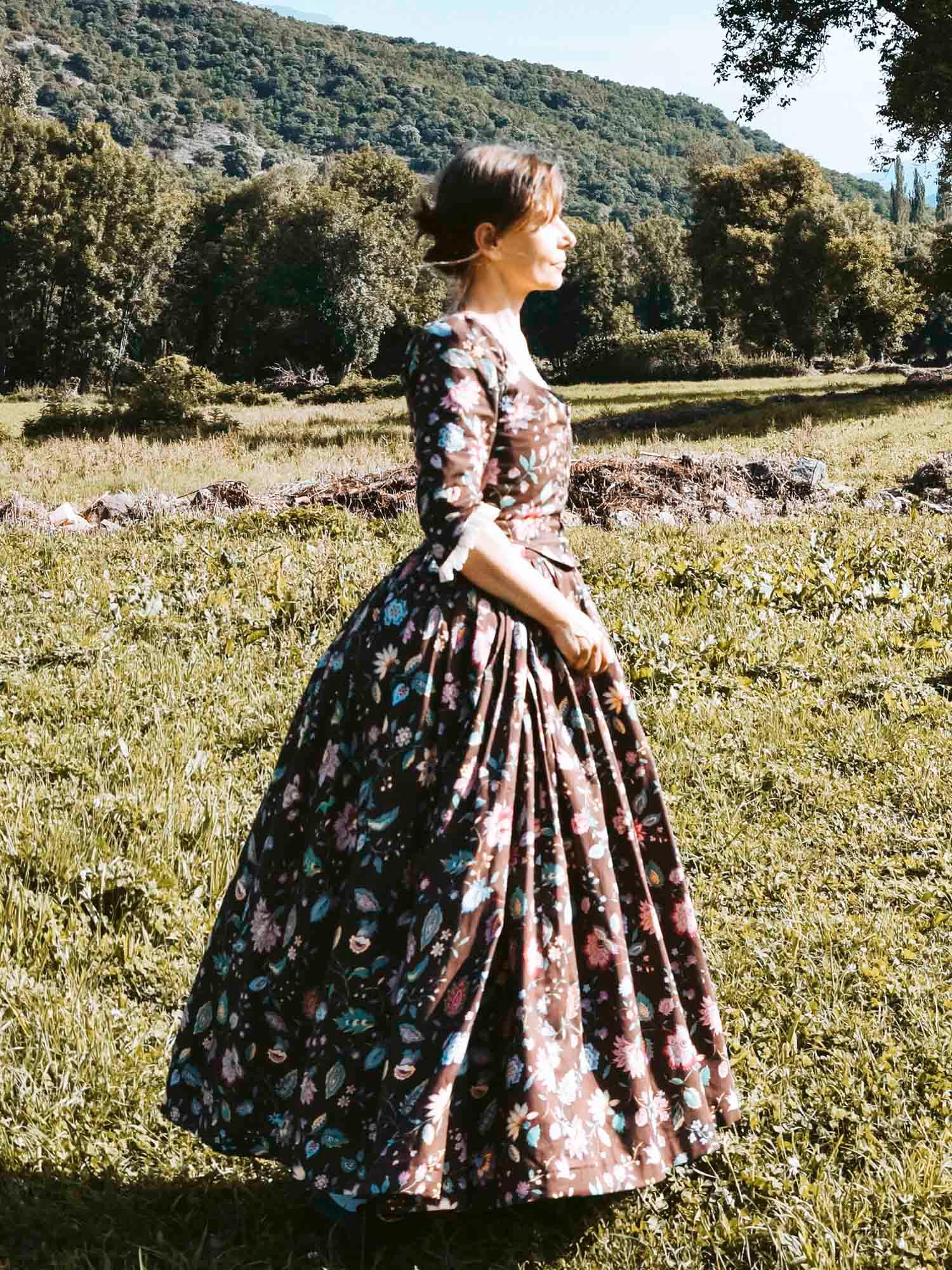 Step back in time with the LOUISE 18th-Century Dress in Brown Chintz Cotton. Meticulously crafted, this reproduction captures the timeless elegance of the renowned "English dress" worn from 1770-1785.