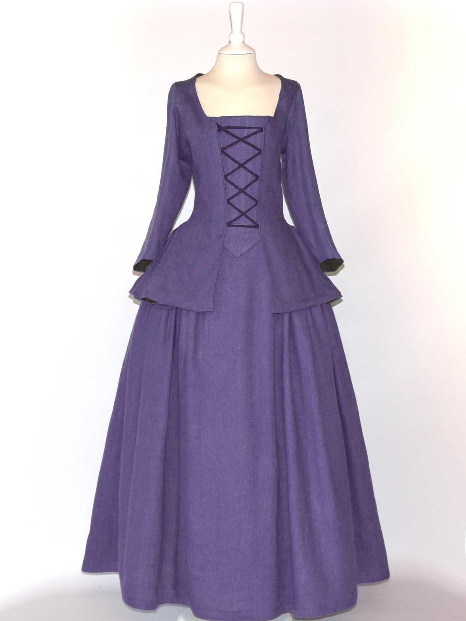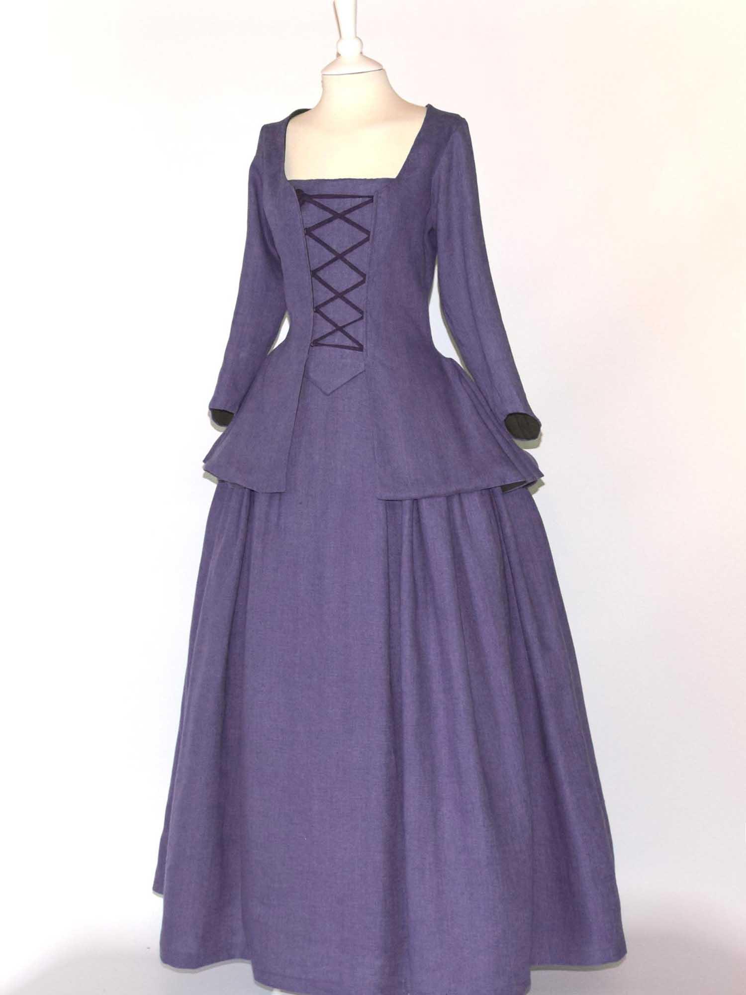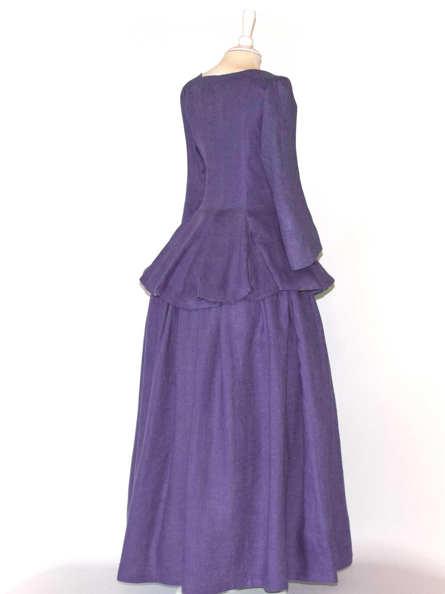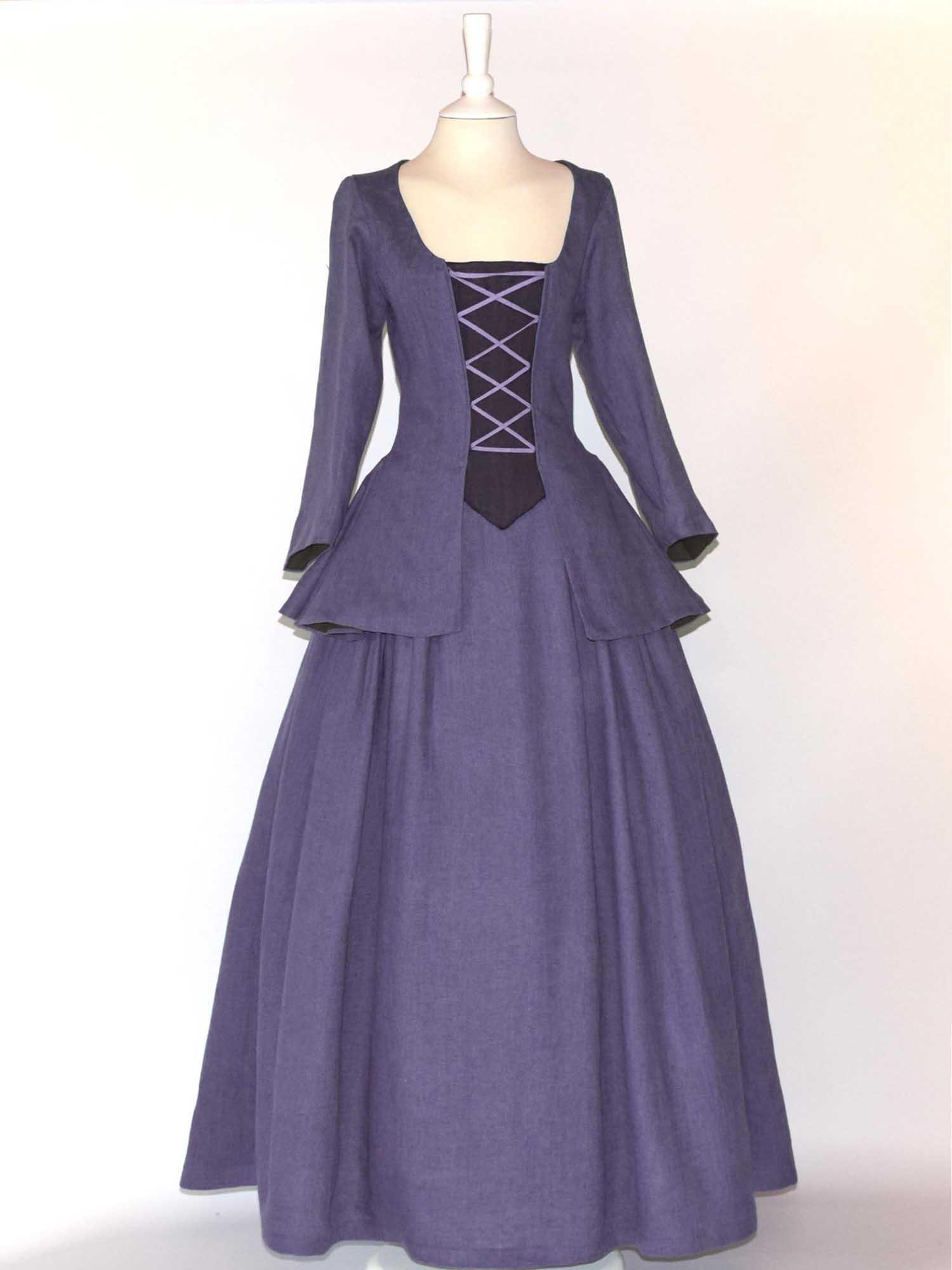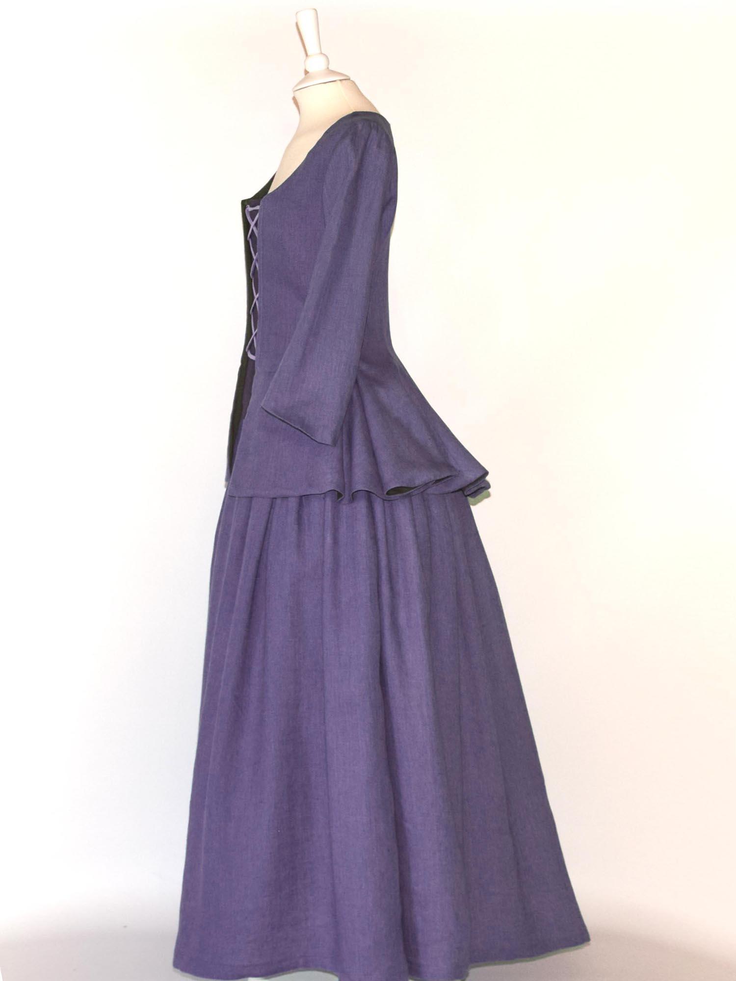 The medium weight laundered linen jacket, in a rich plum purple hue, features a long-skirted silhouette, while two interchangeable stomachers in Night Blue and Plum Purple linen offer customisation. Pleated to perfection, the 18th-century-style petticoat adds authenticity.