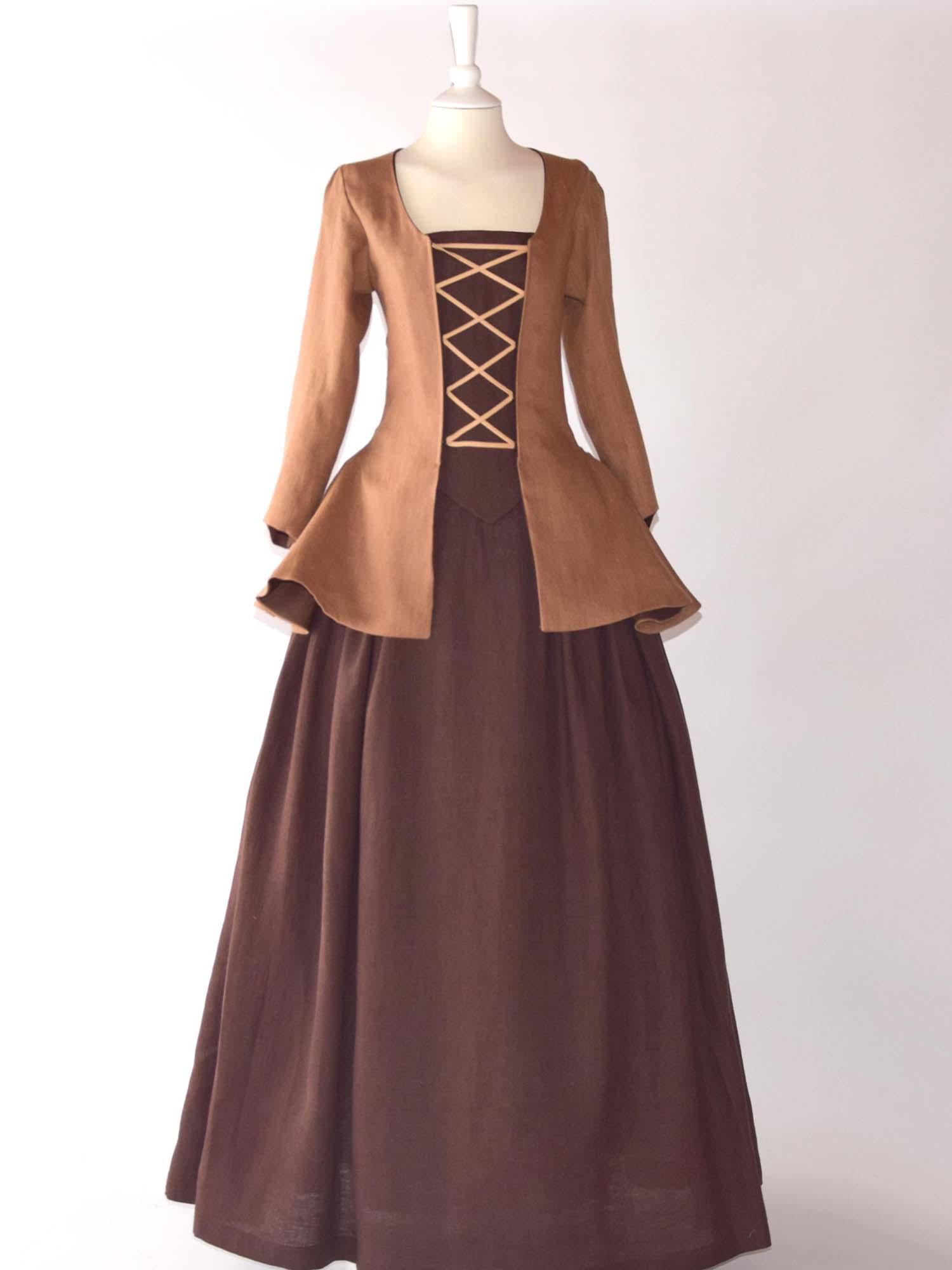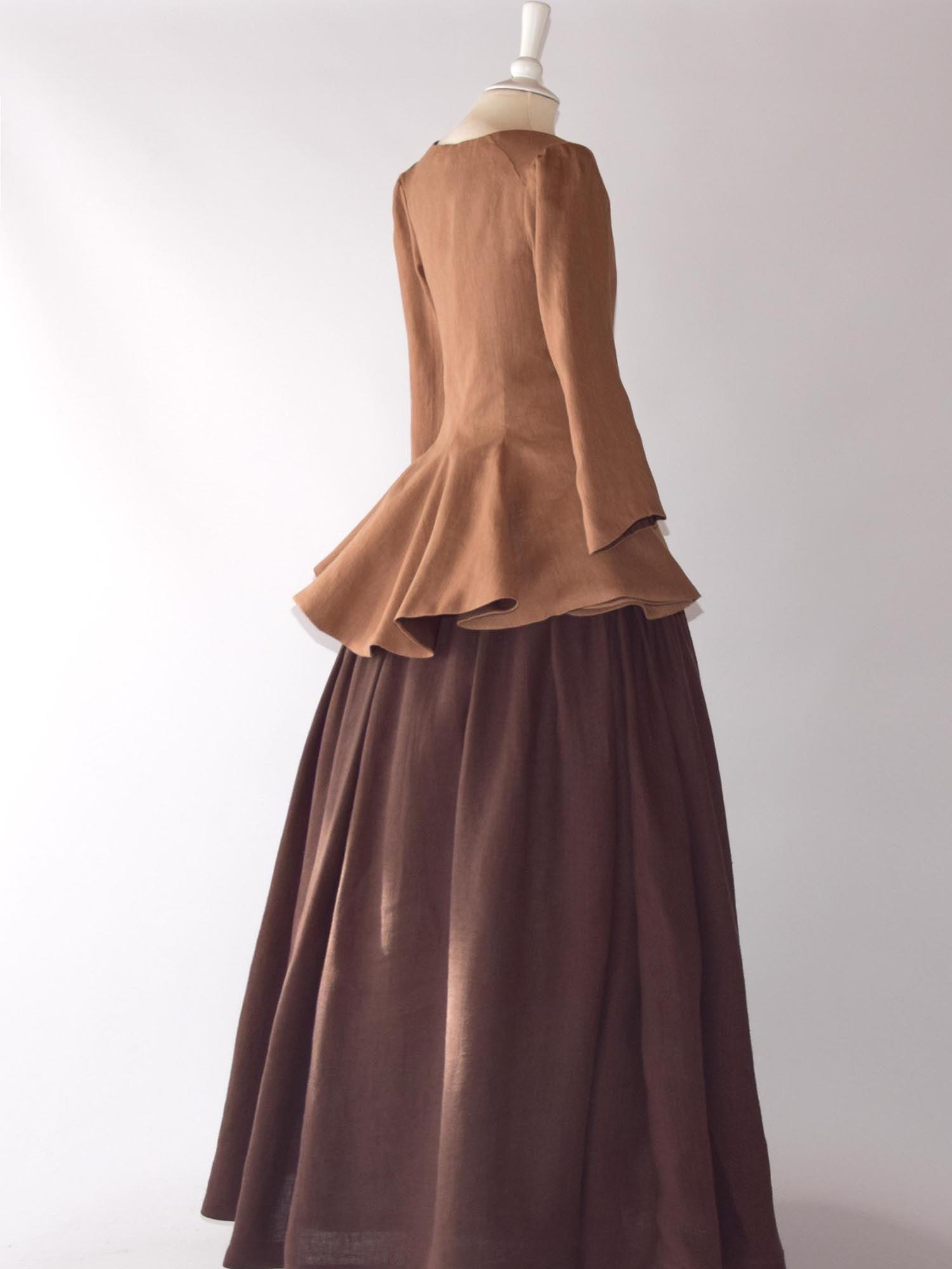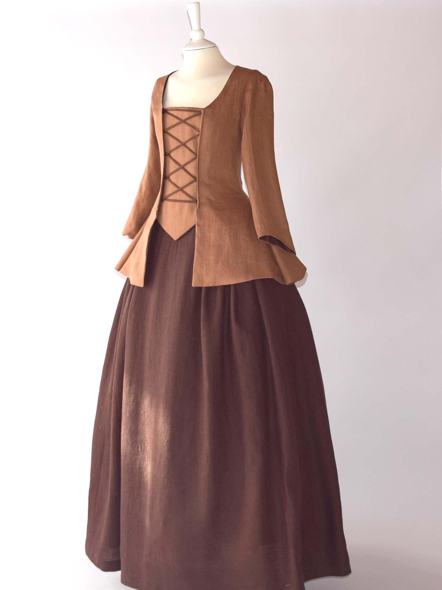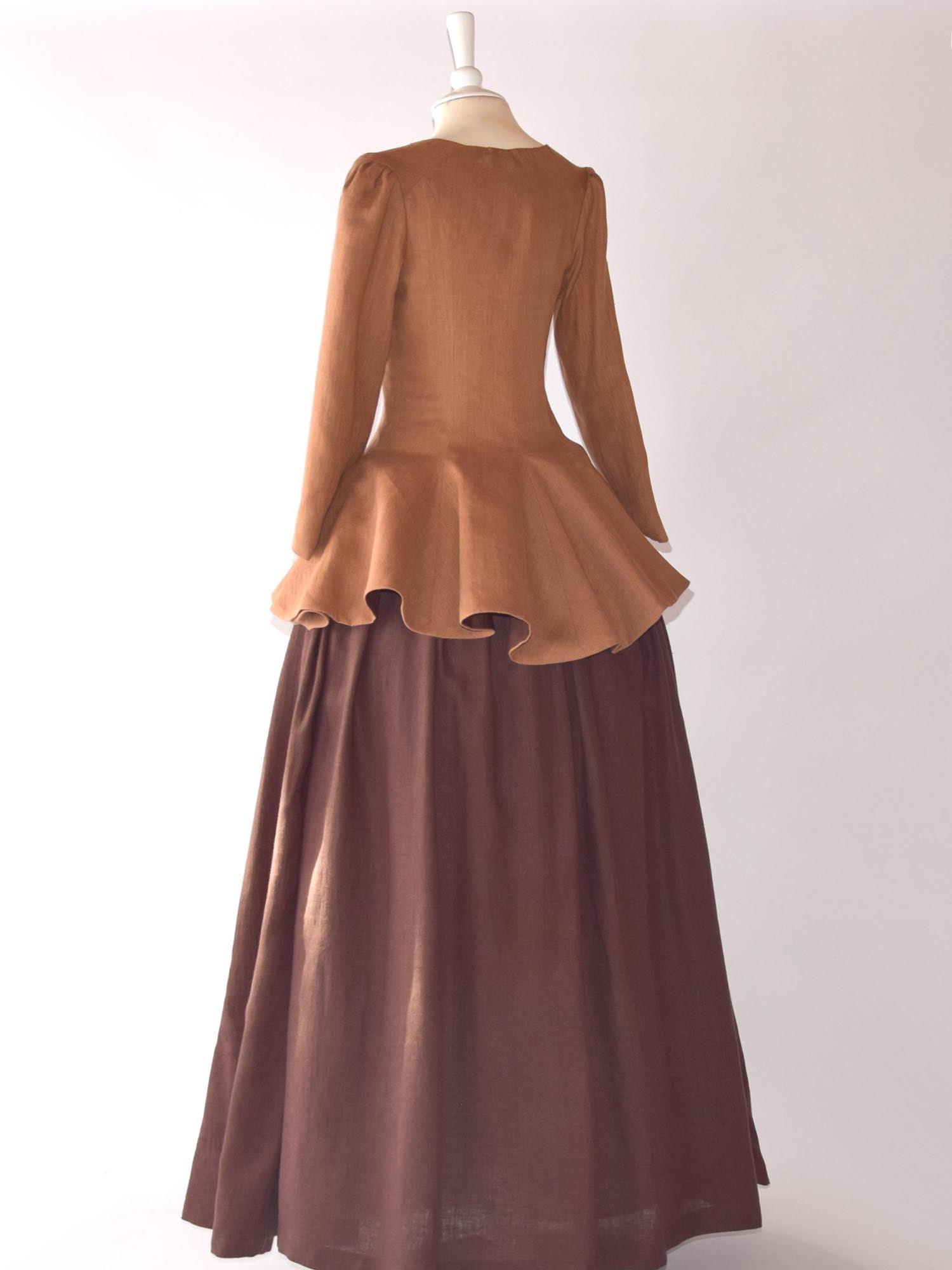 Le point central de cette tenue captivante est la veste à basques, accompagnée de deux stomachers en lin caramel et chocolat. La jupe plissée du 18ème siècle, d'un riche brun foncé, dégage une impression d'authenticité, tandis que la doublure en coton naturel de la veste assure le confort. Combinez la veste à basques sans effort avec n'importe quelle jupe de notre boutique et dévoilez votre style unique.