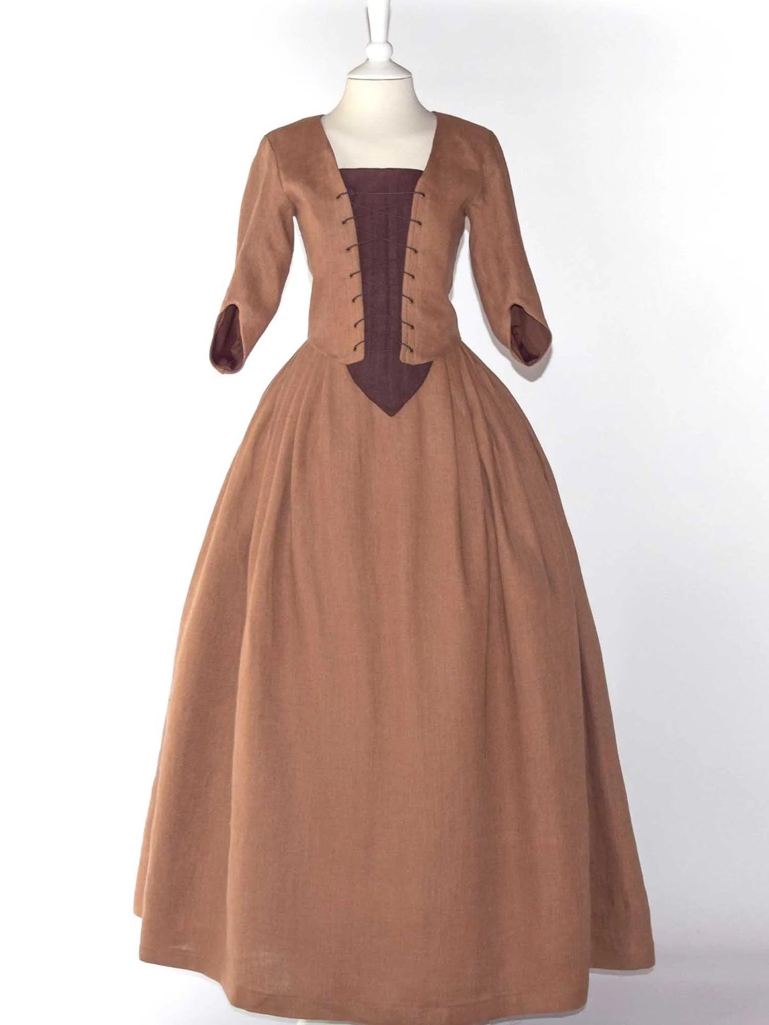 Entrez dans l'univers fascinant du 18ème siècle avec ce costume historique, parfait pour votre prochaine reconstitution historique, événement ou fête à thème. Inspiré des vêtements de la fin du 18ème siècle portés dans la populaire série télévisée Outlander, cet ensemble de quatre pièces se compose d'un bustier à lacets, de 2 stomachers (en lin caramel et chocolat) et d'une longue jupe plissée, tous fabriqués à partir de lin prélavé de haute qualité.