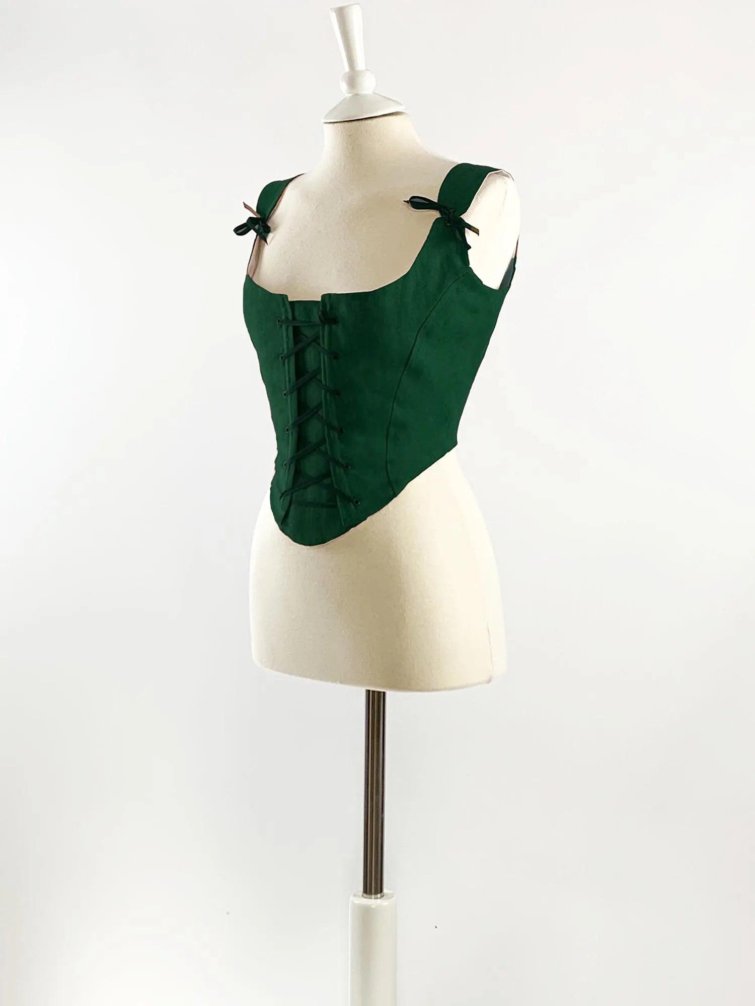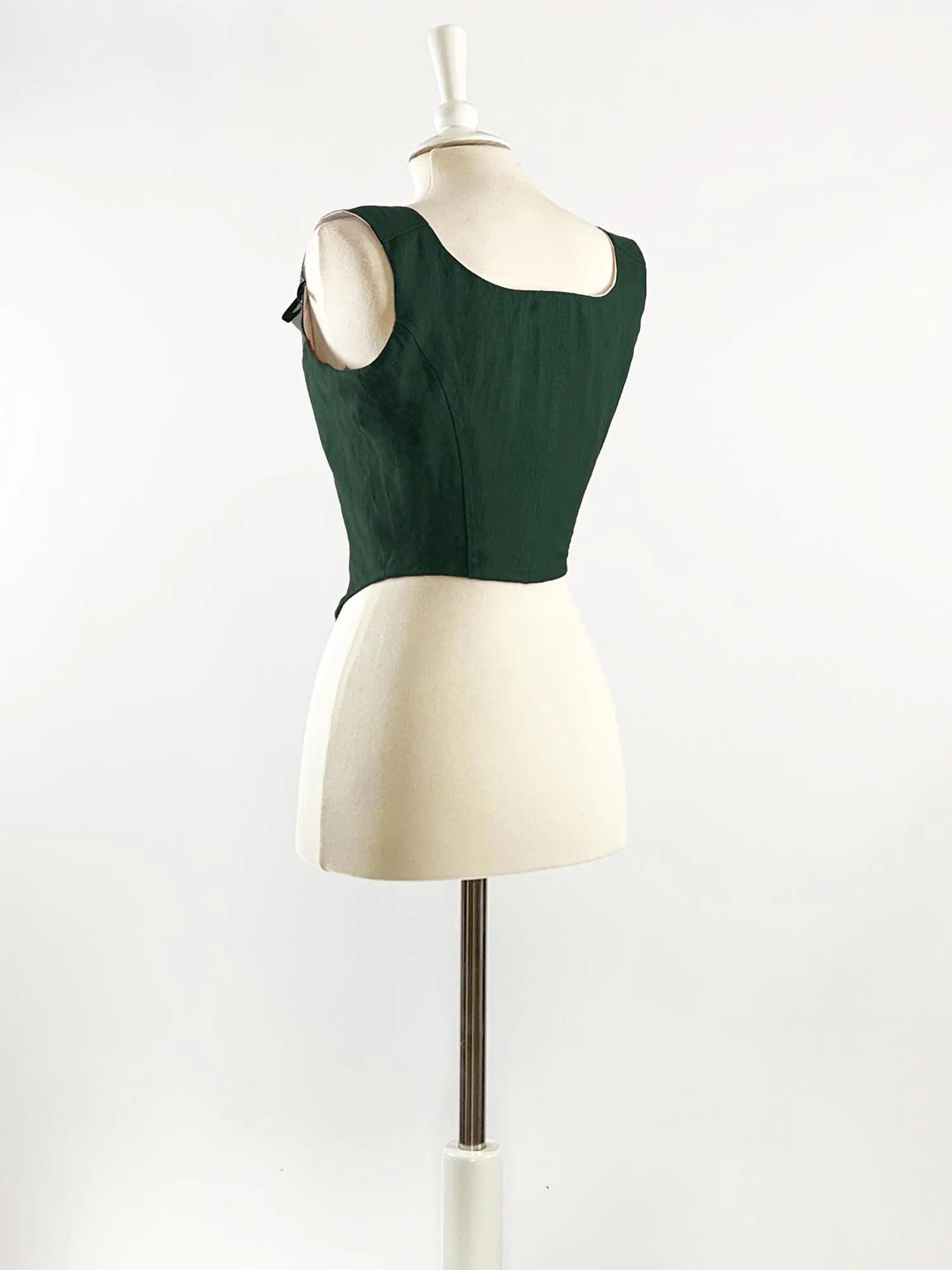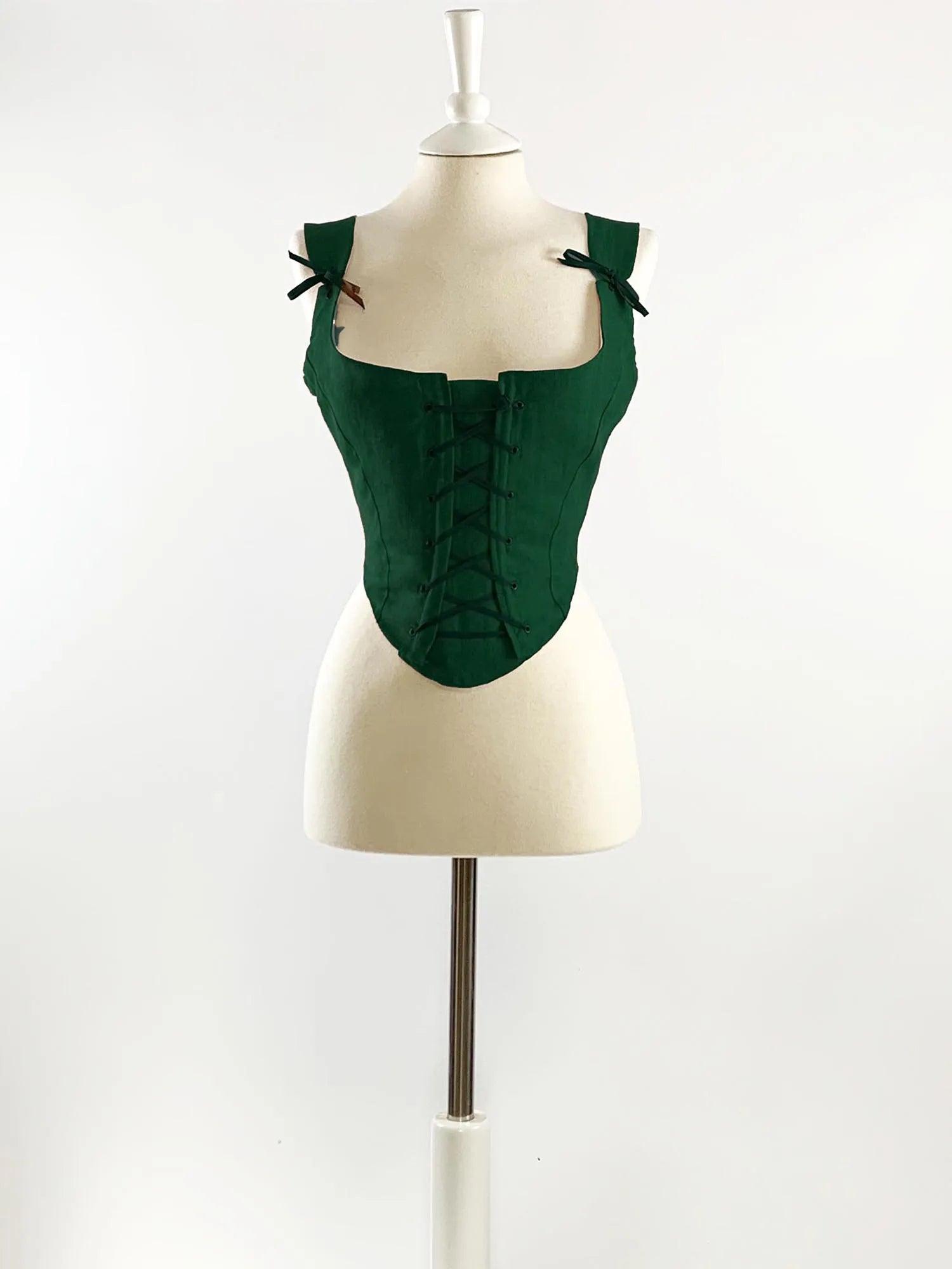 Découvrez la grâce intemporelle d'ISOLDE, notre corset de Paysanne en lin vert sapin. Fabriqué en lin luxueux, il allie sans effort style et confort, en flattant votre silhouette et en la mettant parfaitement en valeur.