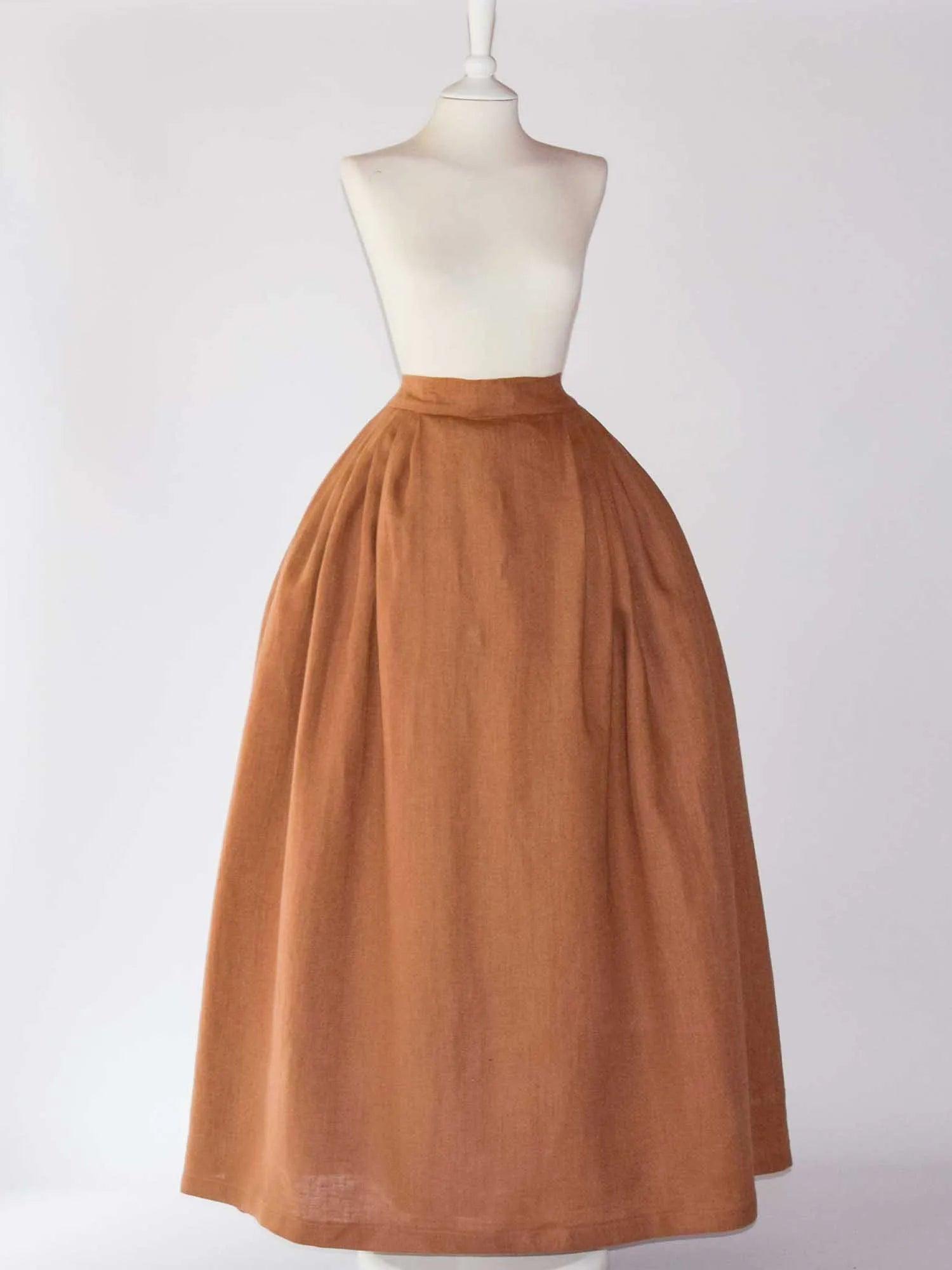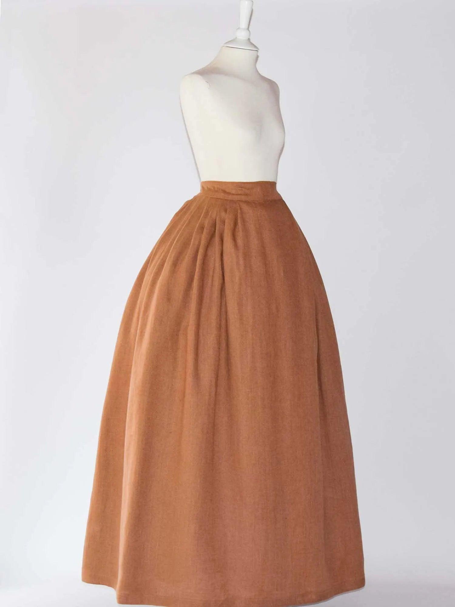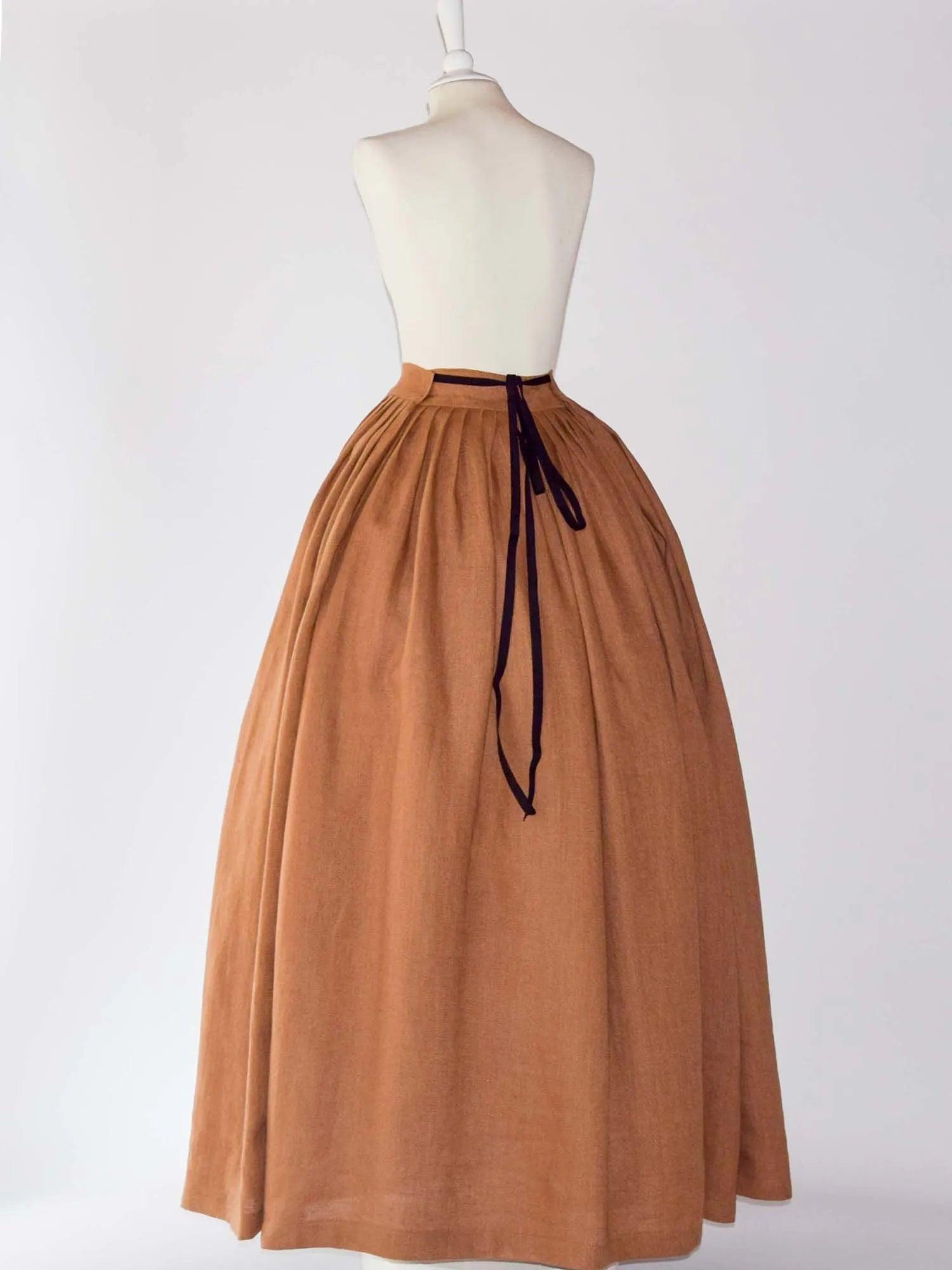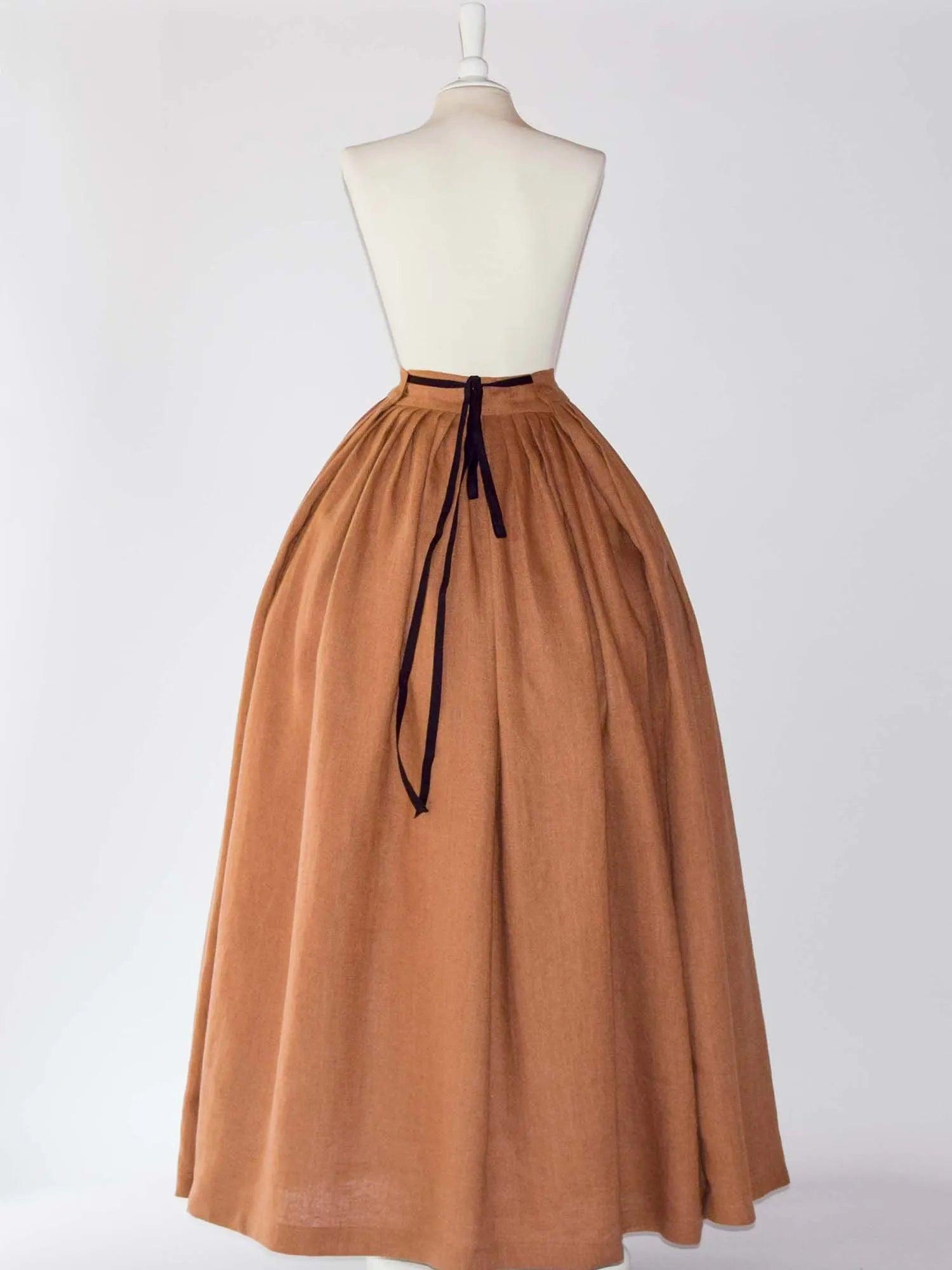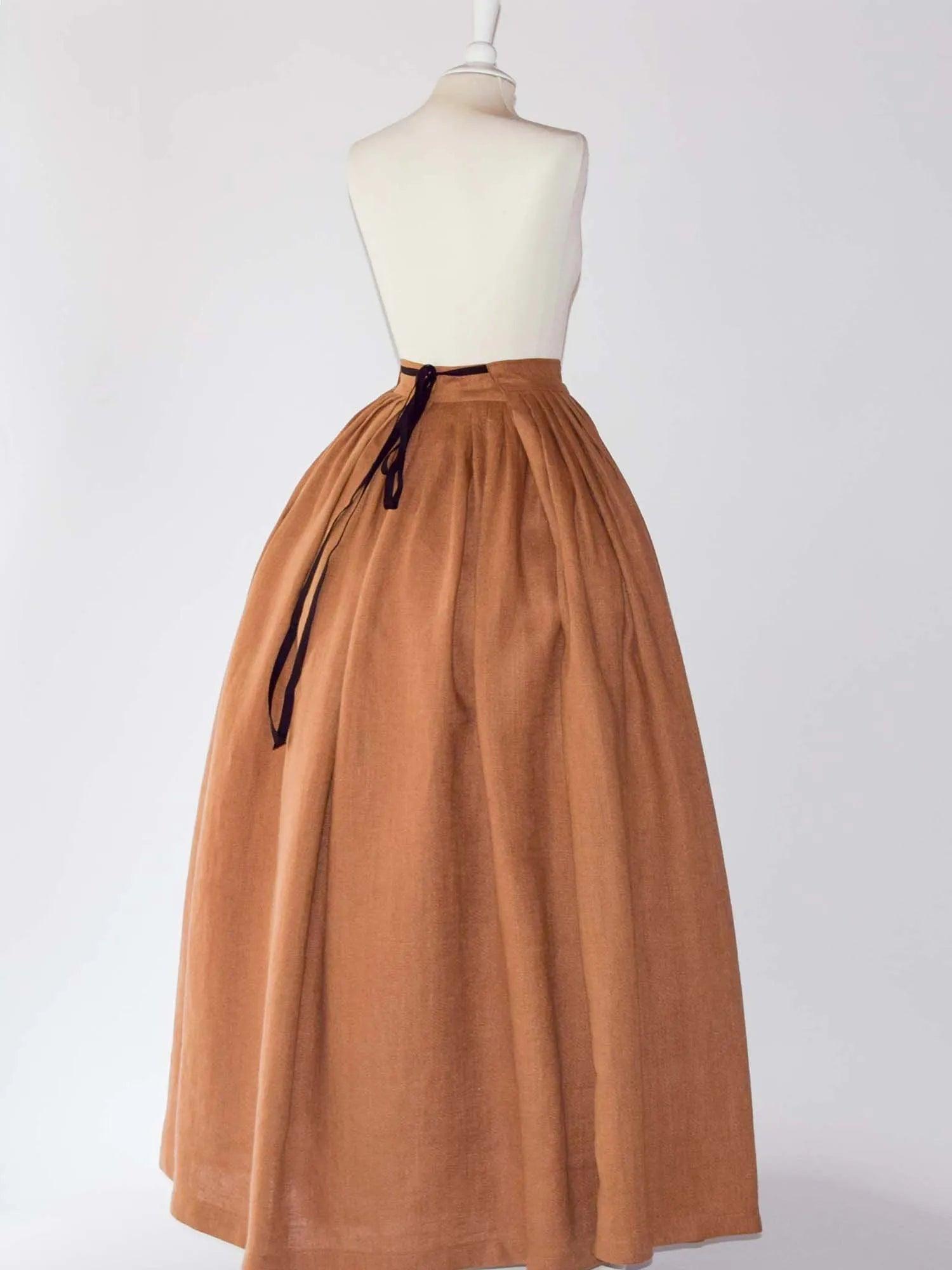Plissée dans le style du 18ème siècle, elle comporte deux panneaux de lin adouci 100 % biologique de poids moyen, créant une portée de 3 mètres (4,5 mètres pour les tailles les plus grandes) élégamment authentique . Avec son design intemporel et sa chaude couleur caramel, cette jupe s'associe sans effort avec n'importe quel bustier, veste ou corset de la boutique.