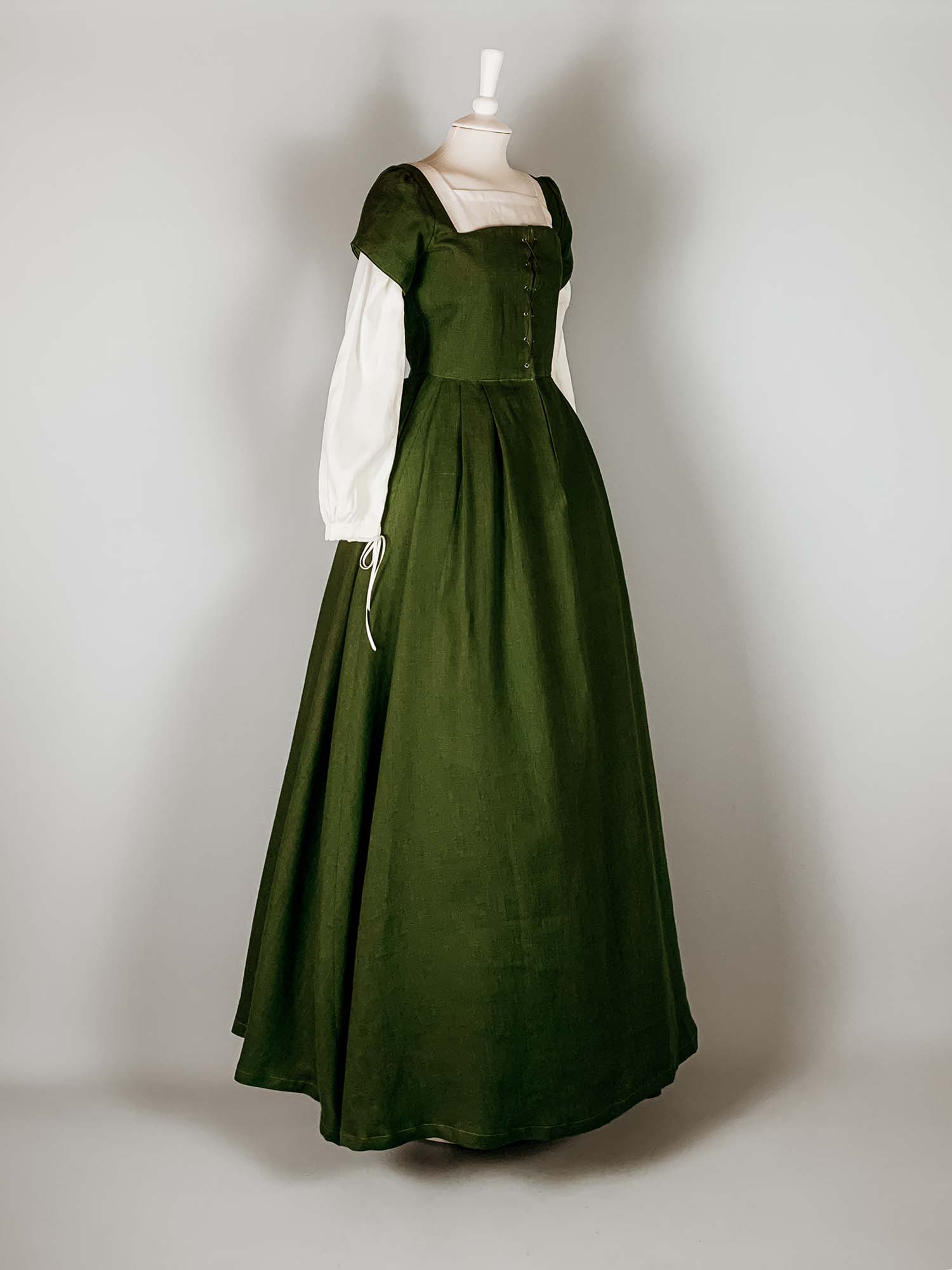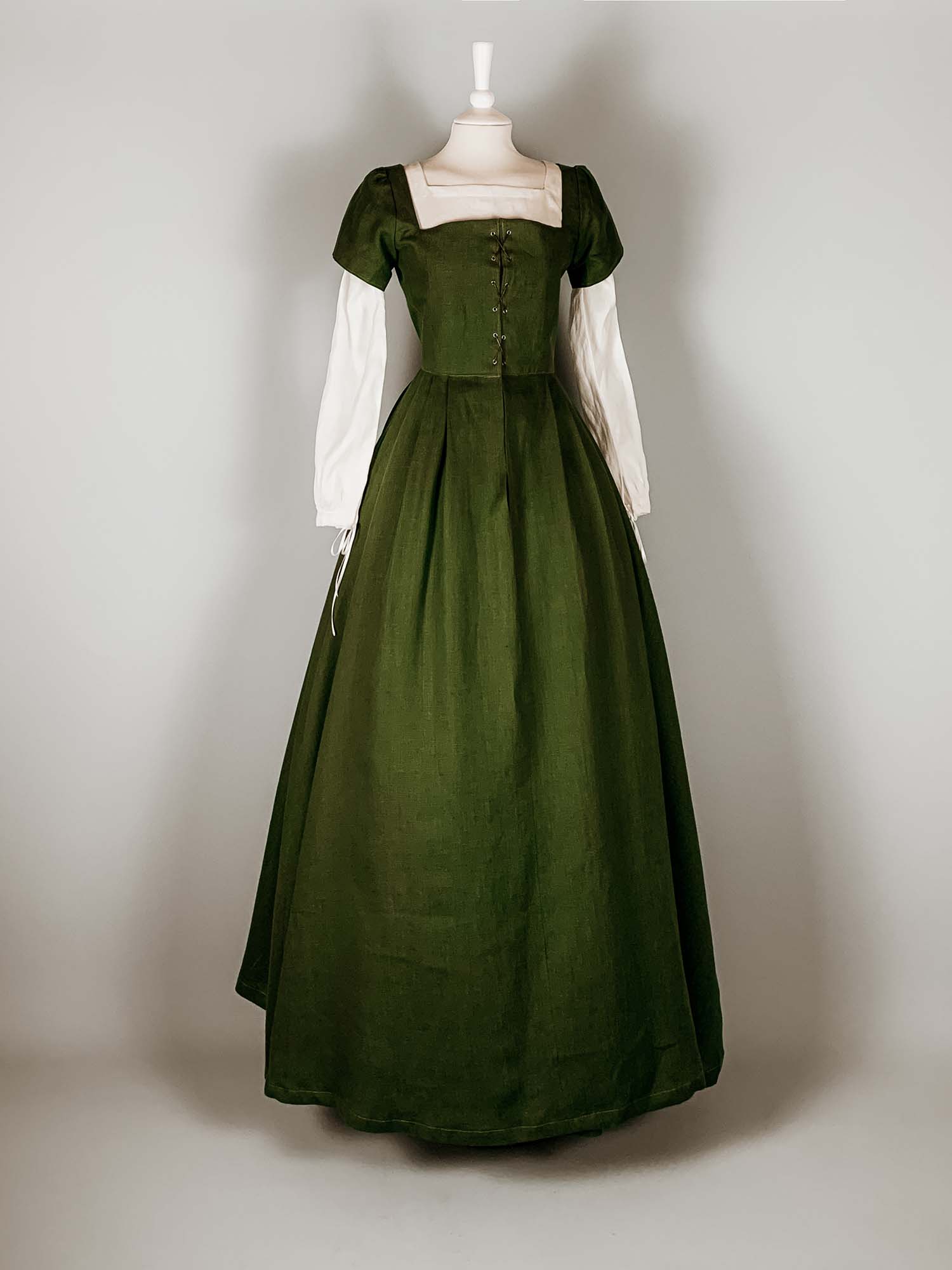 Robe Renaissance en Lin Vert, Manches Courtes, Laçage Frontal