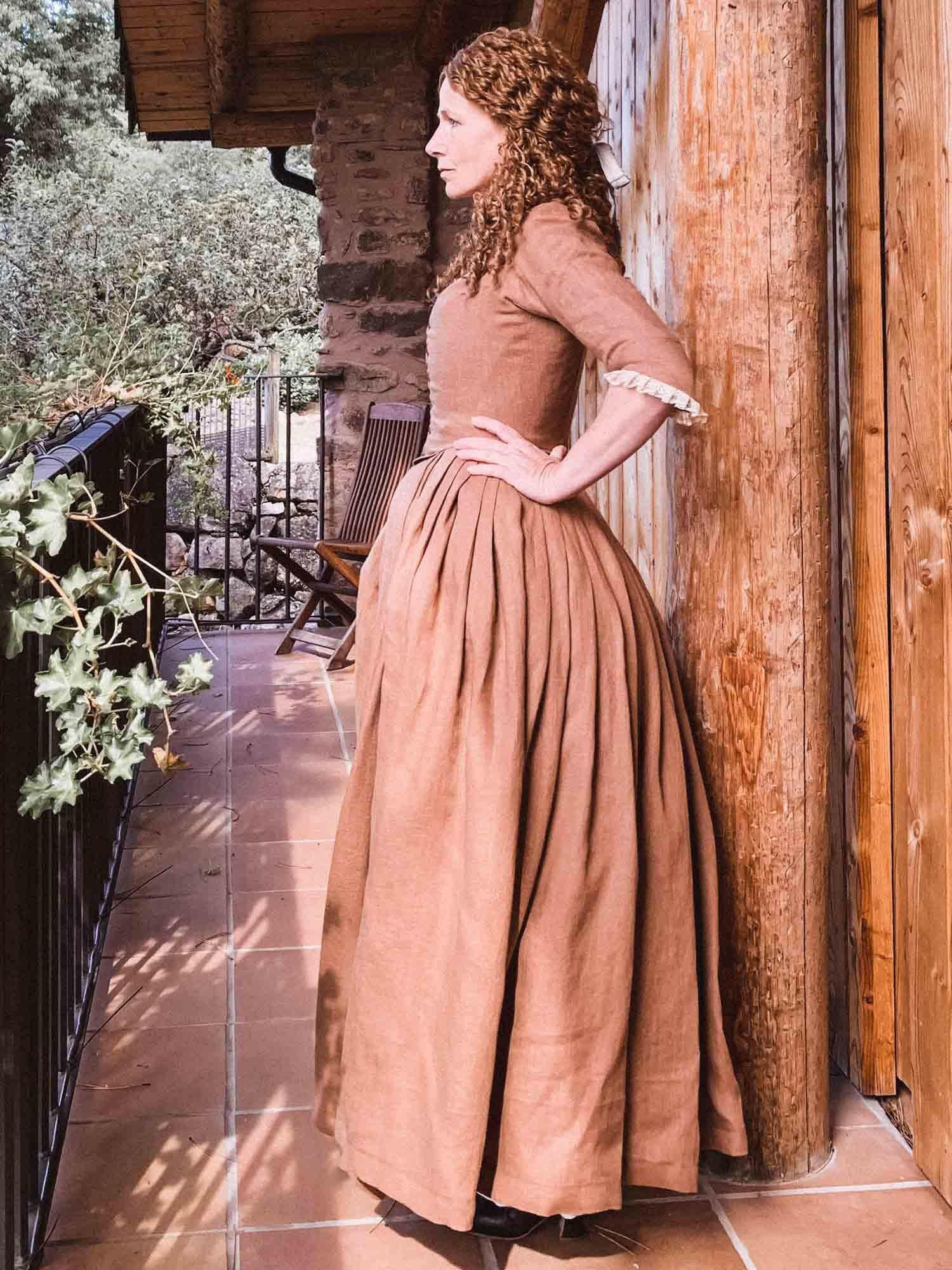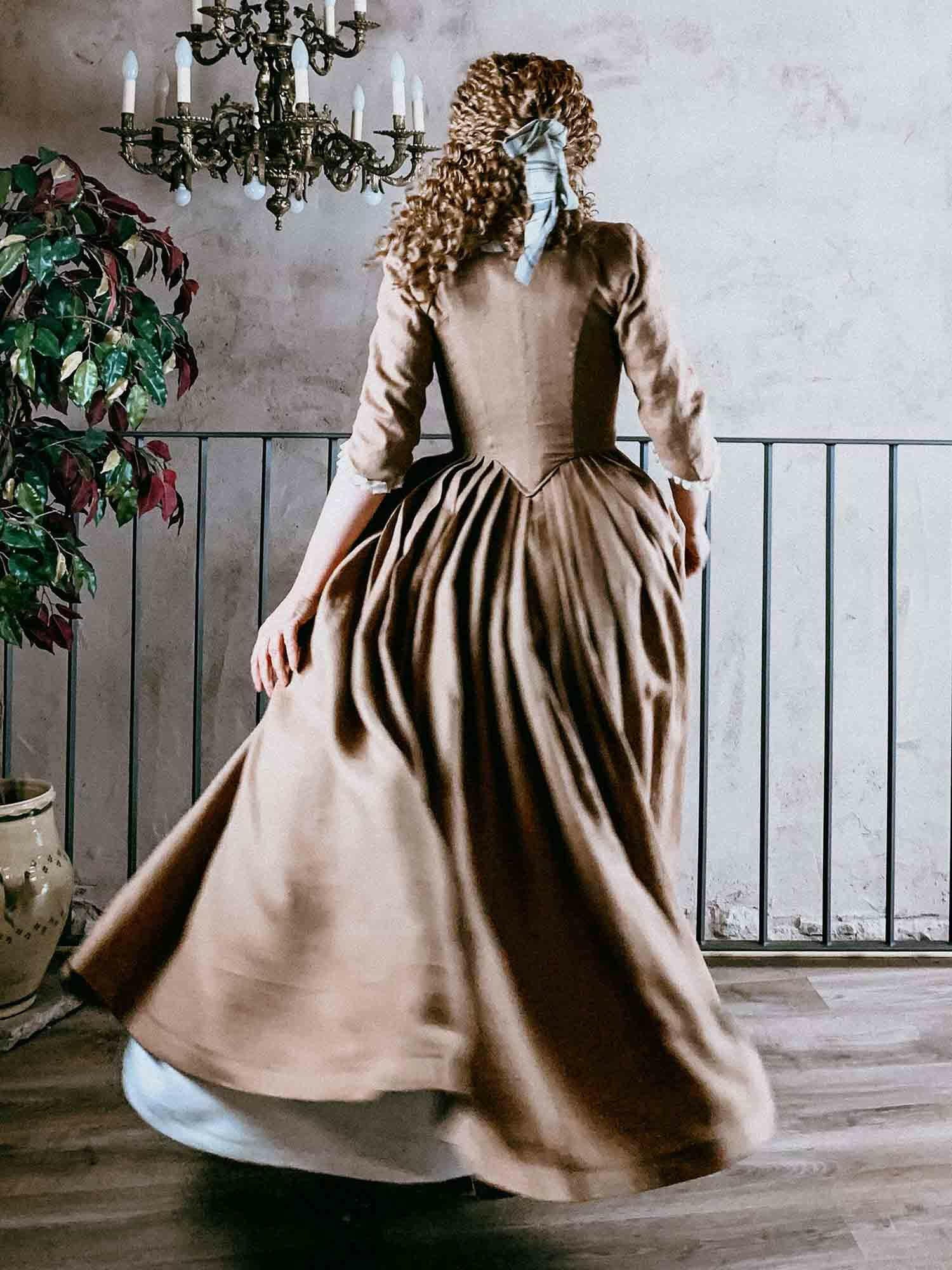 This dress is more than just a garment; it's a piece of wearable history, an expression of a love for vintage style and a testament to the timeless appeal of well-crafted, beautiful clothing. Make a statement with the LOUISE, 18th-Century Dress in Toffee Linen, and wear a piece of history.