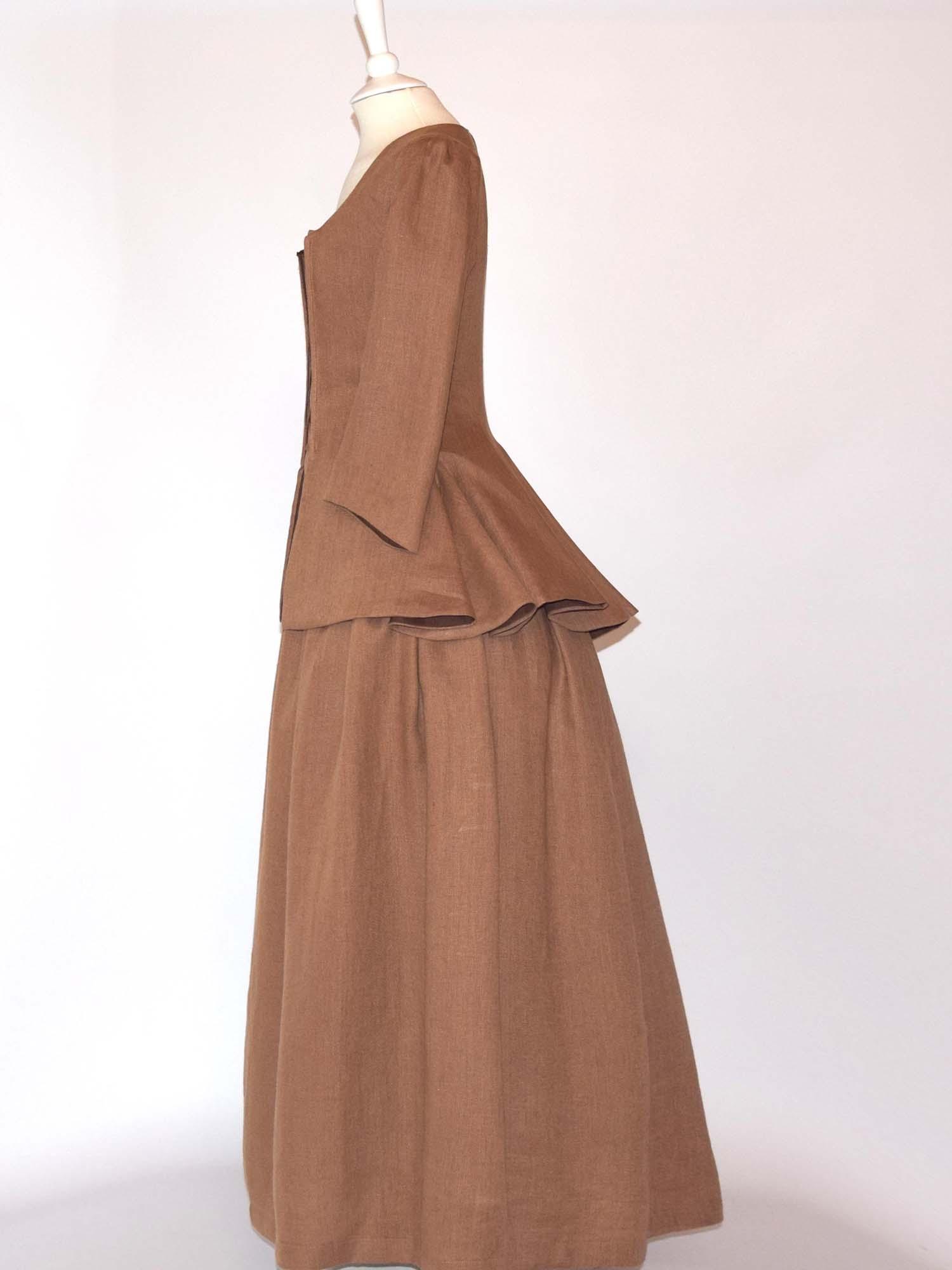 Our colonial costume features a long-skirted jacket, crafted from sumptuous toffee linen, two stomachers in toffee and chocolate linen, allowing you to mix and match for a truly versatile look. The skirt, is pleated according to the 18th-century style, adding an authentic touch to your attire. You can also pair the jacket with any skirt from our store to create endless combinations and express your unique style.