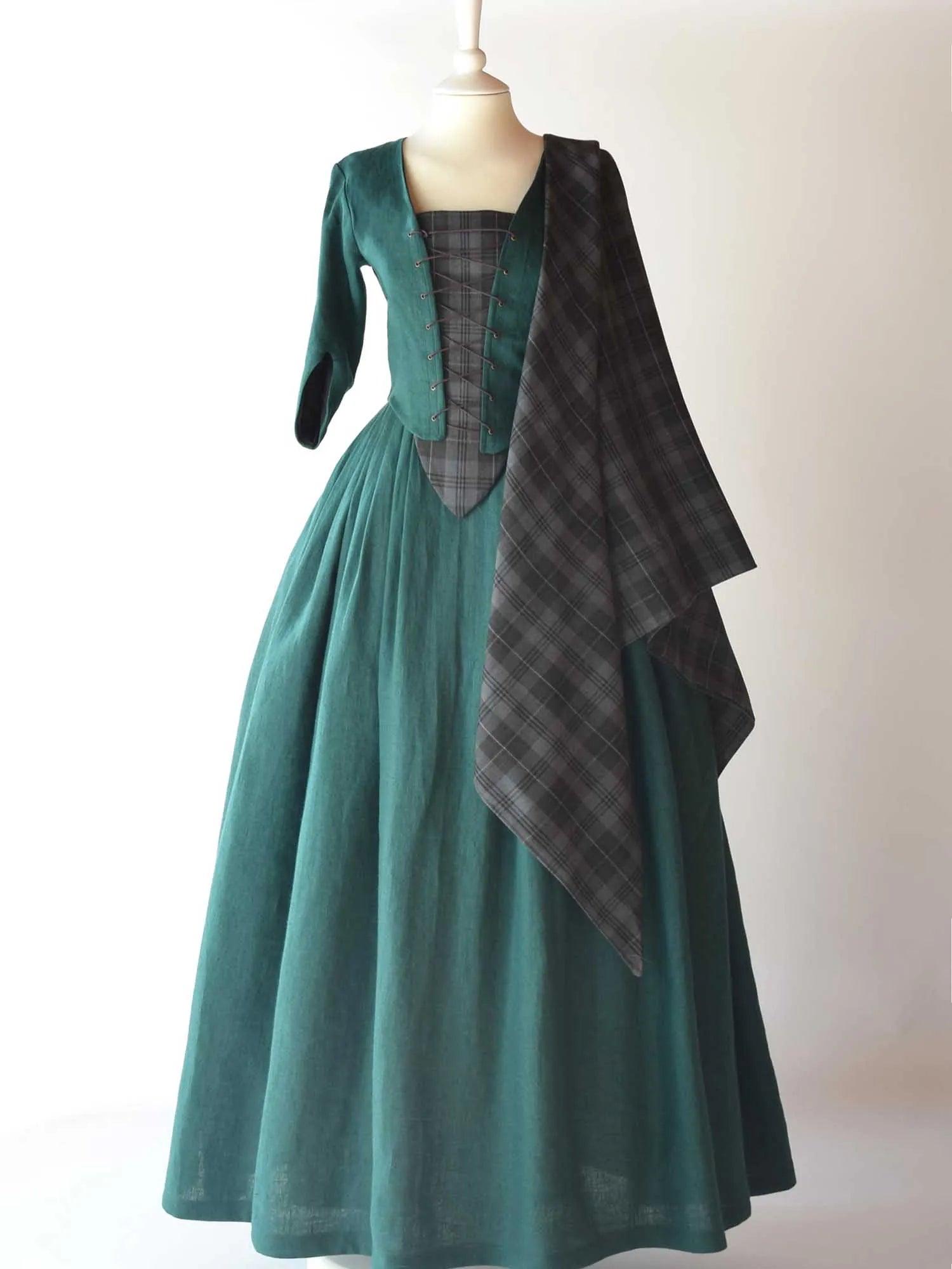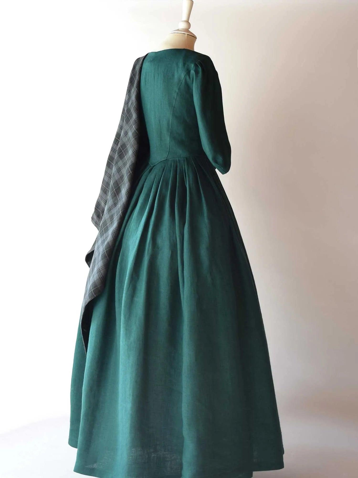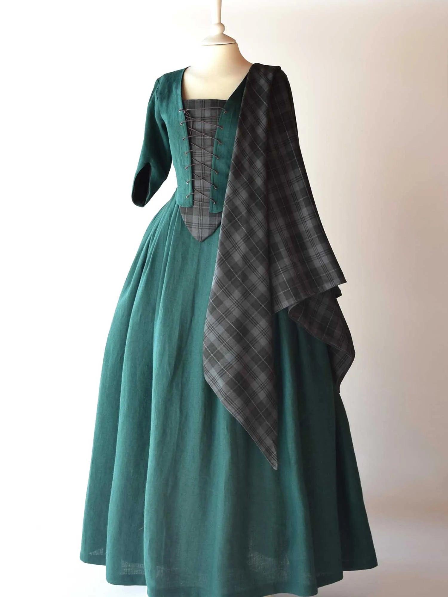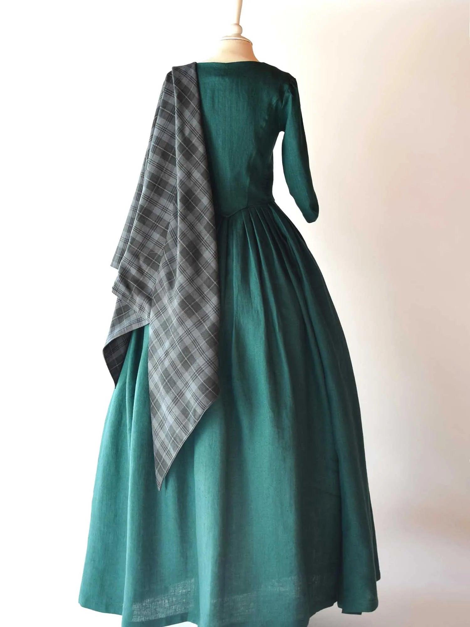 Historical Costume in Dark Green Linen & Silver Granite Tartan