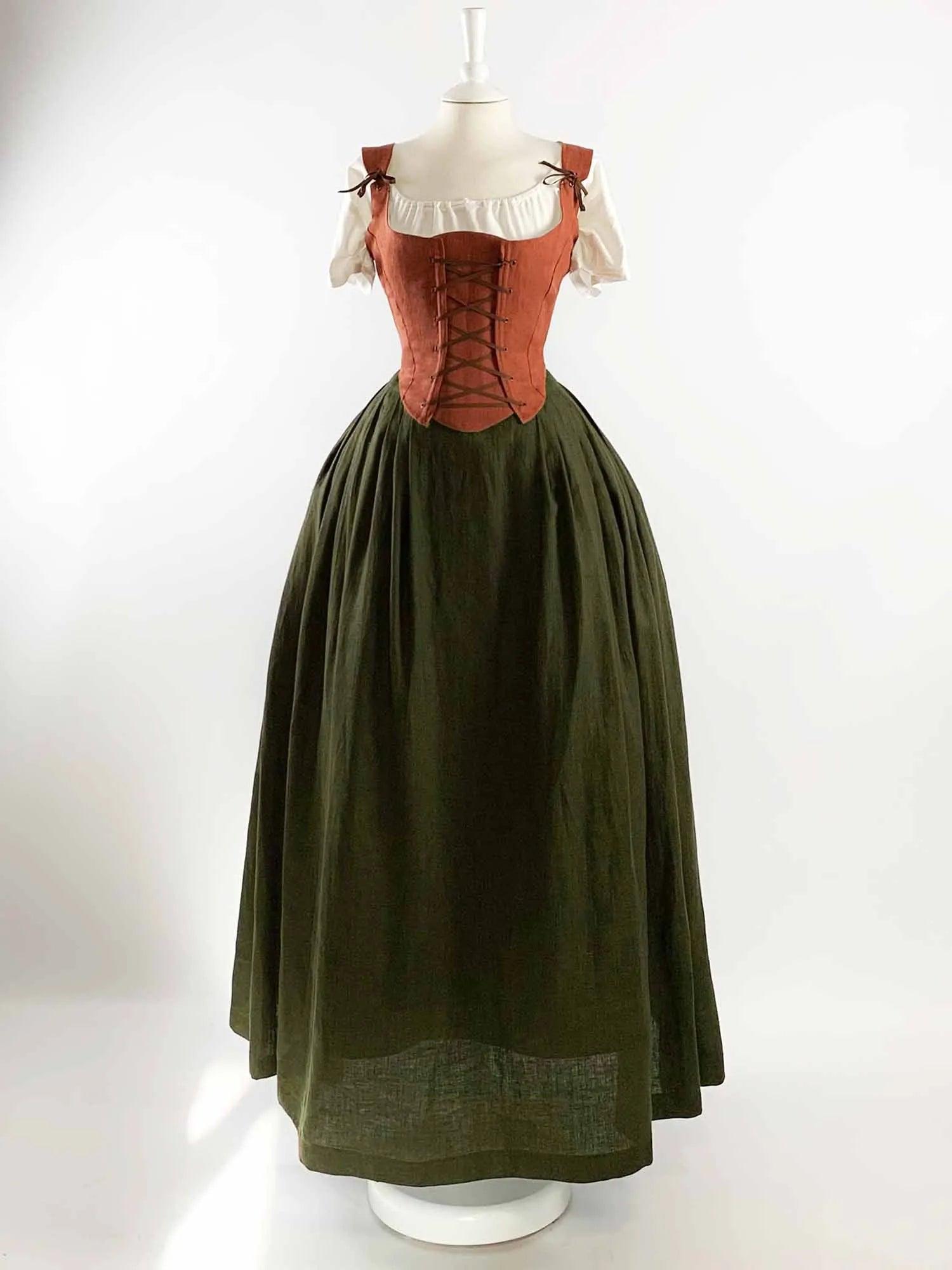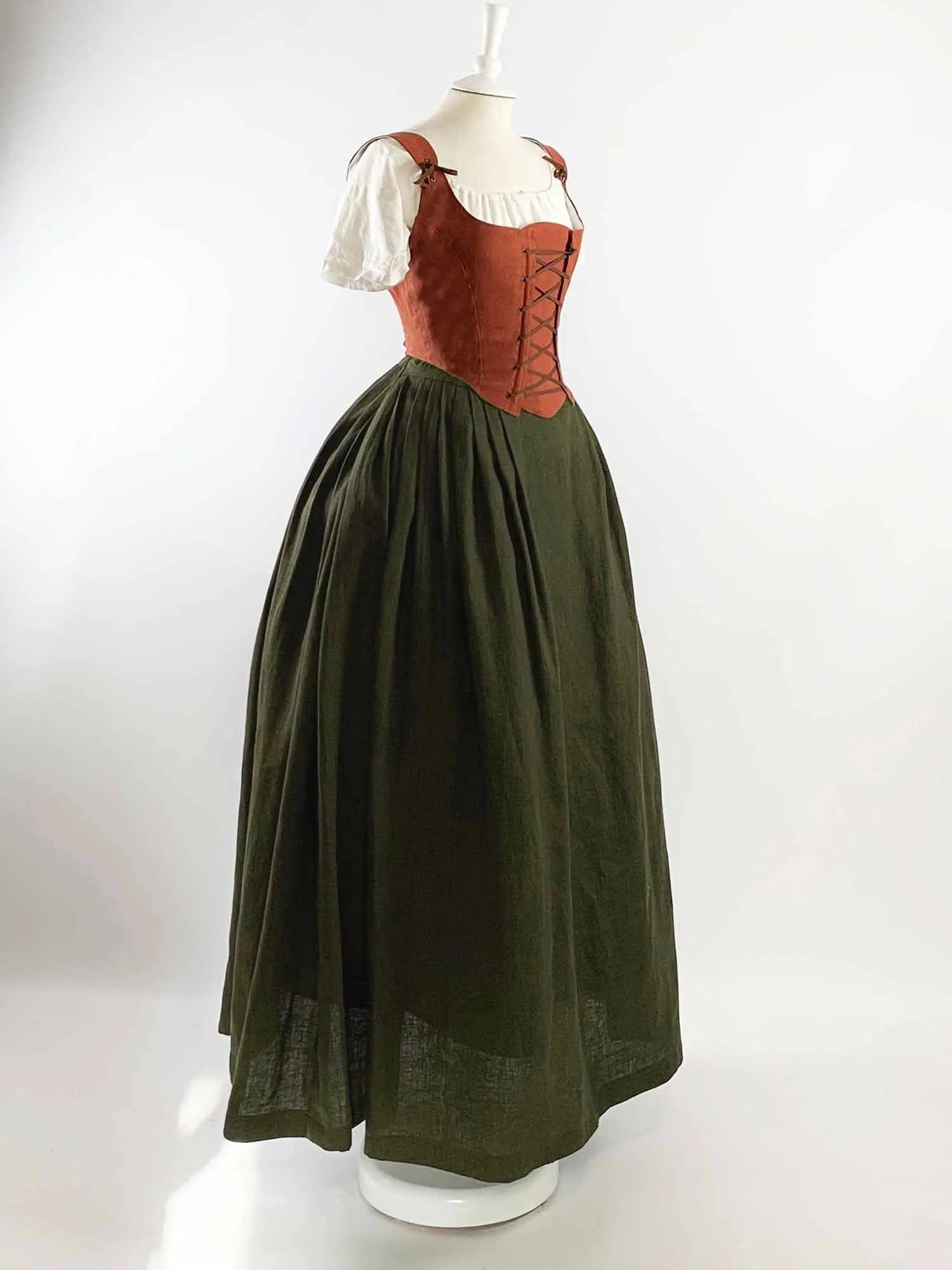 The rust-orange linen corset ensures a personalized fit with adjustable straps and a removable modesty panel. Paired with a moss-green historical skirt and a light, white cotton chemise, it evokes the spirit of the fairytale magic.